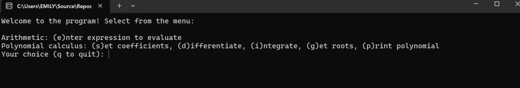 The calculator program included an interactive menu for setting polynomials, evaluating its derivatives and integrals at x values, getting its roots, printing the polynomial, and evaluating arithmetic expressions. Users can interact with the calculator through the console on Visual Studios.