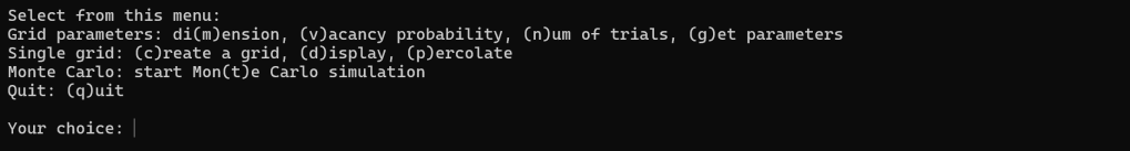 The simulator included an interactive menu for configuring grid parameters, running simulations, and visualizing results. Users can interact with the simulation through the console on Visual Studios.