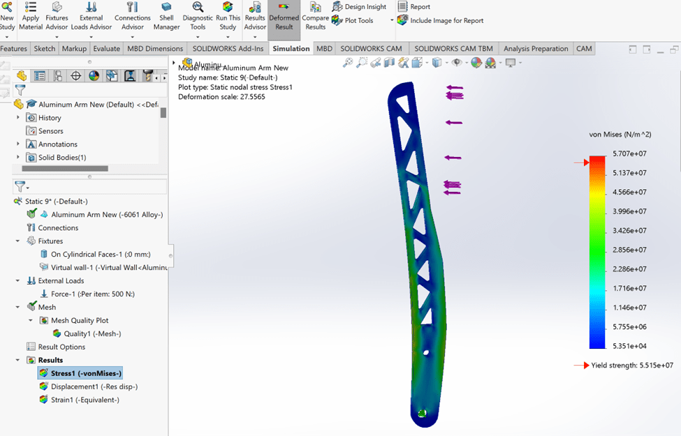 I designed and created a CAD model of the selected aluminum throttle pedal arm design in SolidWorks. I figured out the required thickness of the arm by completing simple beam bending hand calculations, as the maximum width was constrained by the throttle stop dimensions. I then verified this by applying iterative loading simulations using the FEA functionality in SolidWorks and using topology optimization to get an idea of how I could weight optimize this part. Finally, I added triangle cut outs which reduced the overall part weight by over 20% and added fillets and chamfers at the force concentrations to complete the design.
