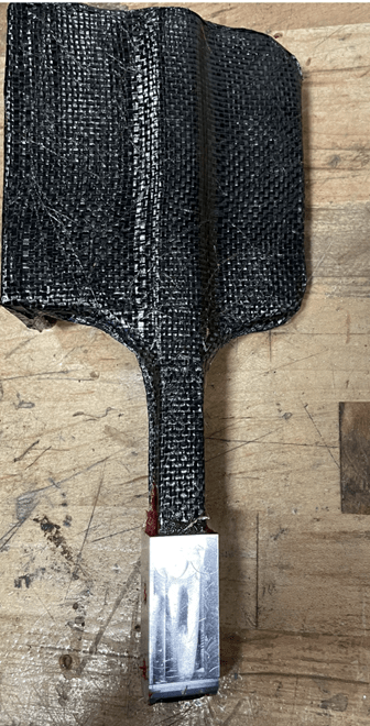 Billet was added in increments to the testing jig up until failure occurred at 40 lbs (~178N). The pedal arm failed at the interface between the pedal face and the arm. This was expected as there would be force concentrations at the 90-degree bend in the carbon fiber layers at the face. However, this was not where the highest bending moment stresses in the arm would occur, which means the stress concentrations at the interface exceeded the peak bending moment at the base. I was not satisfied with the result of the test loading so I decided to add additional layers of carbon fiber to the next iteration to increase the strength of the face that failed.