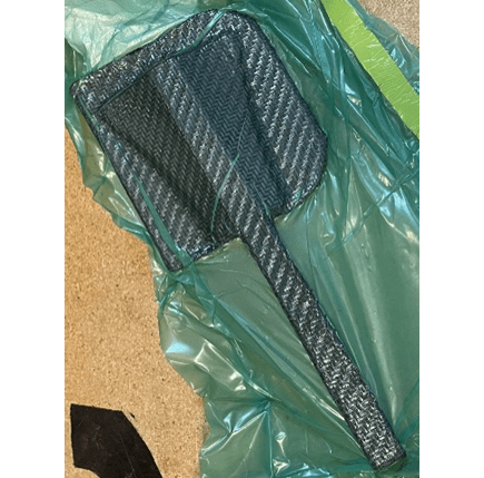 Based on the failure mode during the test loading of the prototype, I decided to adjust the design to make the arm and face out of one piece of foam instead of two. This made the face flush with the pedal arm and completely removed the 90-degree angle responsible for the stress concentration in the carbon layers. As a result, the overall pedal face is approximately 1/3 inch thinner for the same thickness of pedal arm. I also added another taper between the face and arm to further reduce the force concentrations where it broke during proof loading and added additional fillets around the arm and rear face connection. The flag size was kept the same as this was determined by driver feedback from last year and further supported by driver satisfaction with pushing on the prototype. Instead of making the aluminum bracket out of bent sheet metal I used a CNC machined aluminum bracket that I created a toolpath for and ran the machining job myself on a 3-axis mill in the student maker space. This allowed for higher precision and tighter manufacturing tolerances to be achieved. It was then co-cured with 2 layers of film adhesive between the carbon pedal arm and the bracket. I also sandblasted and Aluma-prepped the inner surfaces of the bracket for better adhesion of the two faces. The same cure cycle was used as the prototype, along with vacuum bagging to increase the consistency of manufacturing.