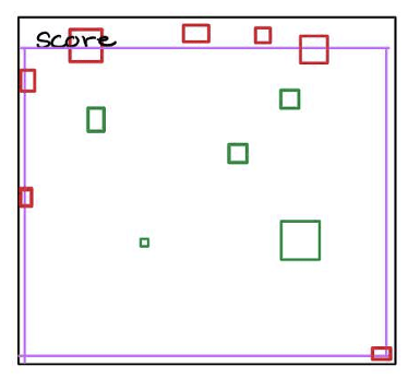 The diagram above depicts the prey placement. Green boxes show valid placements, red boxes are invalid such as on the wall, under the scoreboard, or on the snake’s body.