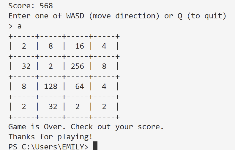 This project provided a hands-on way to explore logic-based game mechanics using Python. It strengthened my understanding of list manipulation, merging algorithms, and input handling in a terminal environment.
