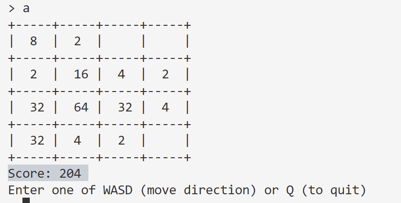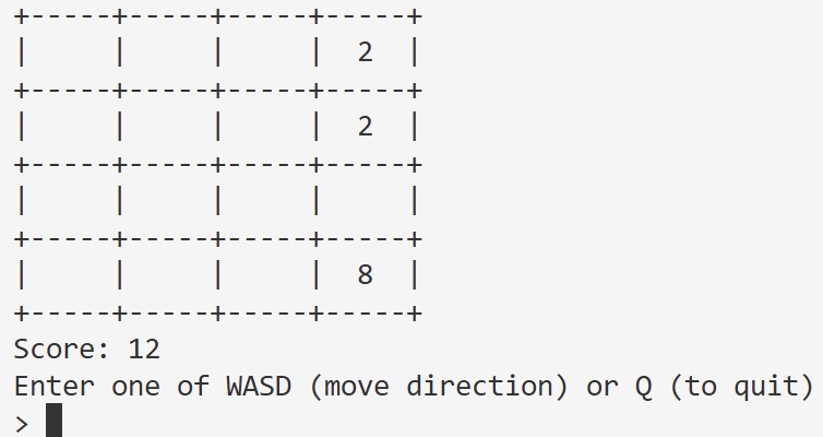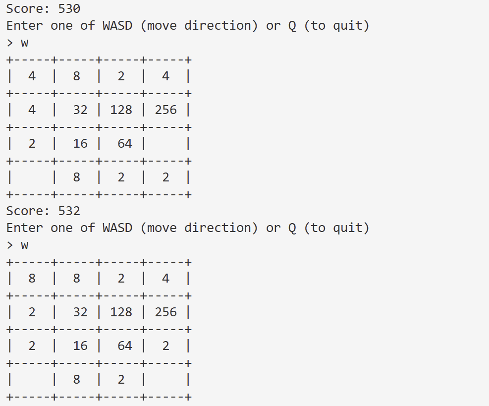 The player interacts using WASD keys to move numbered tiles across a 4×4 grid. Matching tiles combine and double their value, contributing to the score. After every move, a new “2” spawns in a random empty spot. The game ends when there are no empty spaces left.