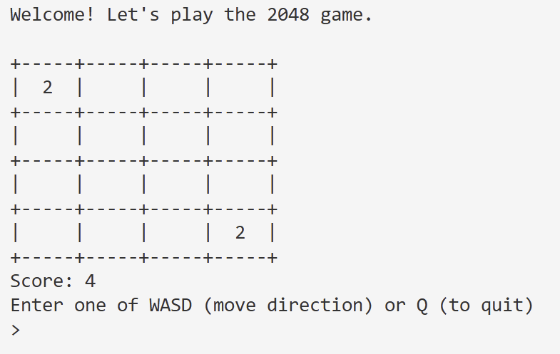 This project is a text-based recreation of the popular 2048 puzzle game, implemented entirely in Python and played through the command line. The focus was on board manipulation logic, merging rules, and user input handling.