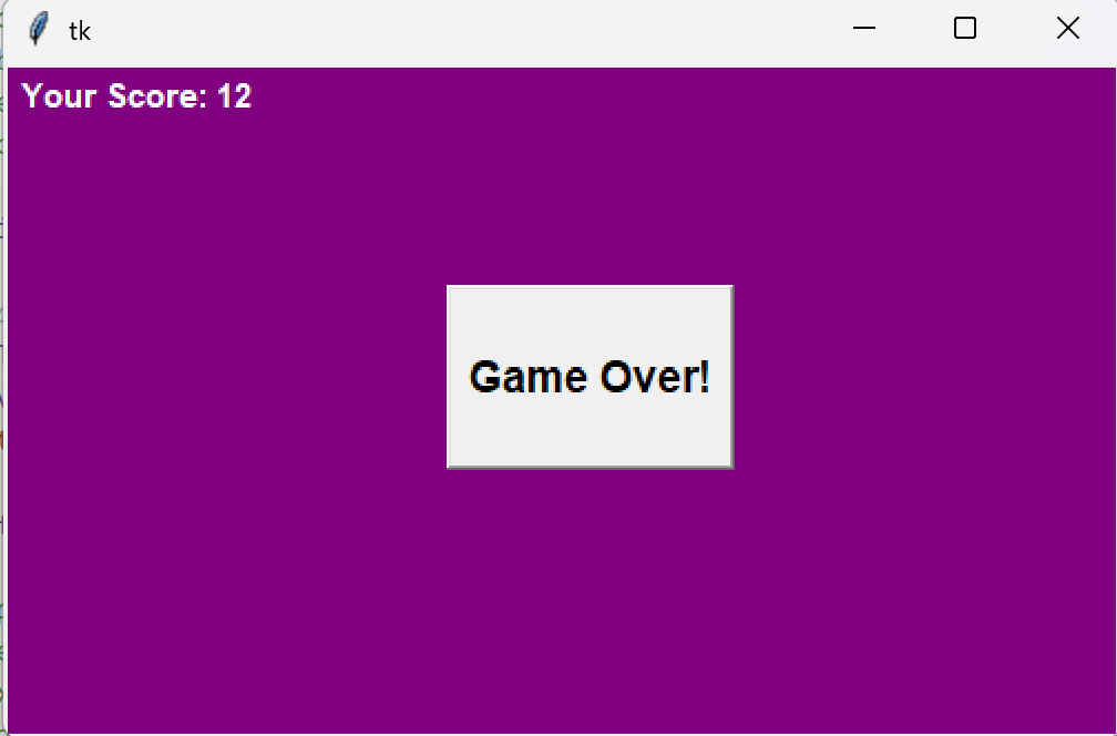If a collision is detected, the game is ended and the GUI displays the “Game Over” notice which closes the window: